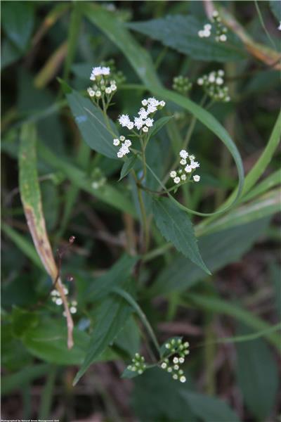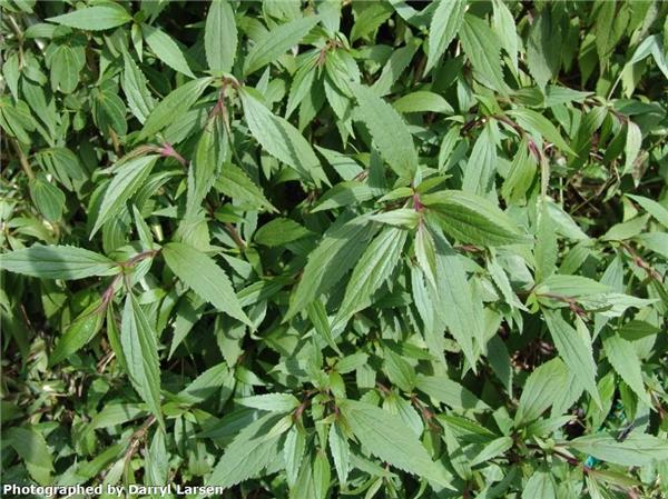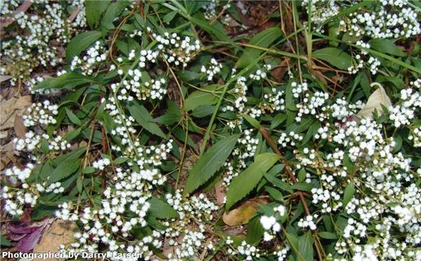 Sprawling, perennial herb to 60cm. Numerous branching stems produce roots at ground level. Leaves opposite to 8cm long and 2.5cm wide, with toothed edges. Flowers white, in small dense clusters at ends of branches in winter. Seeds slender, angular, 2mm long, black with fine white hairs at tip.