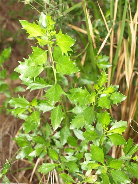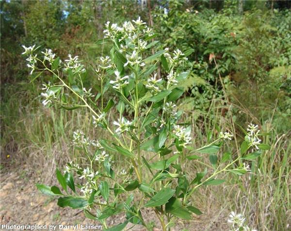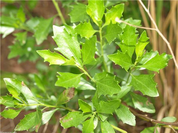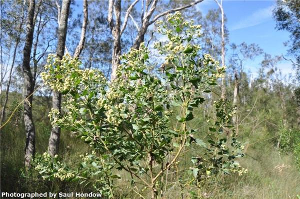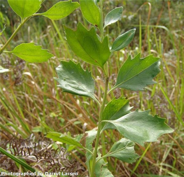 Perennial shrub to 4m. Densely branched. Leaves dull or pale green, alternate, wedge-shaped and lobed in the upper part, 2.5–5cm long. Flowers male (yellow, globular) and female (white florets at end of branches) are present on different plants, 6mm across and numerous. Fruit, straw-coloured or brown, ribbed, 3mm long, topped by tufts of fluffy white hair, making it readily wind-dispersed. Flowers in autumn.