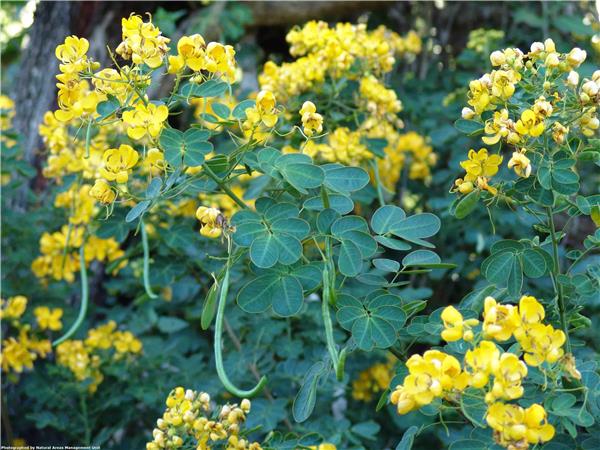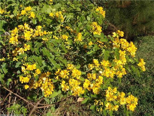 Shrubs that may scramble up to 3m. Compound leaves. Leaflet tips rounded. Flowers showy yellow. Fruit a long green pod, drying with age. Seed to 0.5cm across, very long lived.