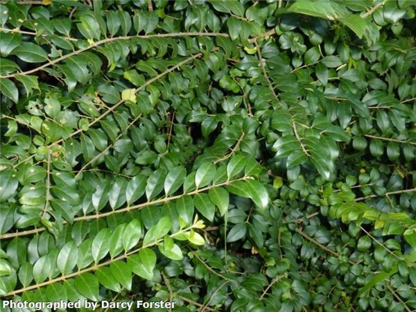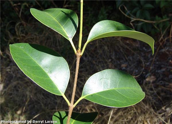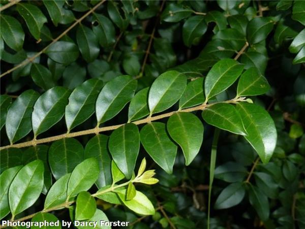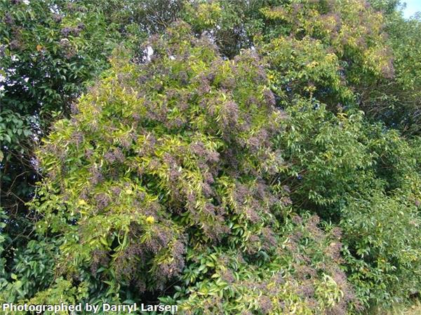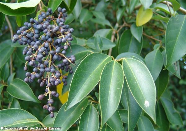 Fast-growing evergreen large shrub or tree to 10m.Stems with many small corky dots (lenticels). Leaves to 12cm long, dark shiny green above, paler and dull below, hairless, pointed at tip. Leaf stalk hairless, 1–2cm long. White, scented flowers each 0.5cm, conical clusters to 25cm on branch tips. Fruits fleshy, oval-round, to 0.9cm, ripen in winter from green/red/black.