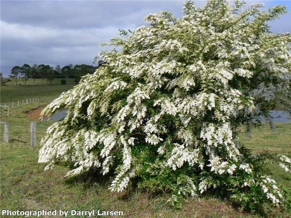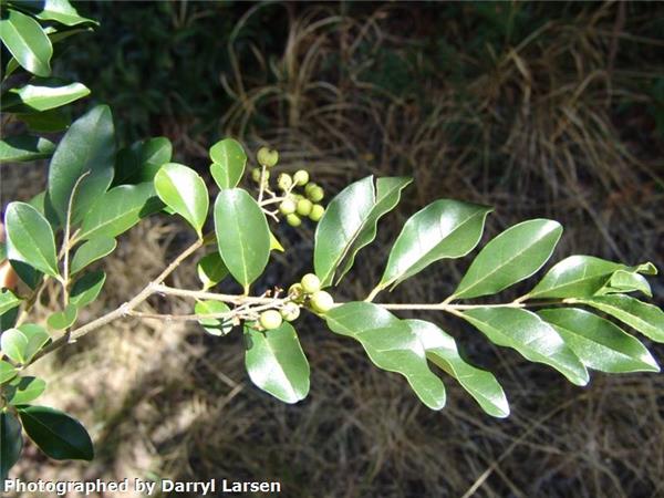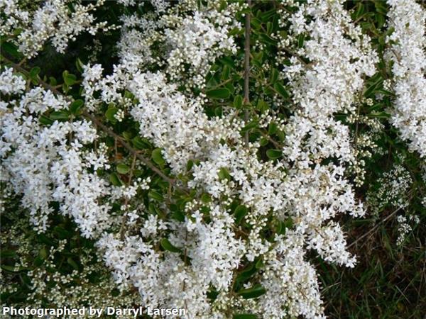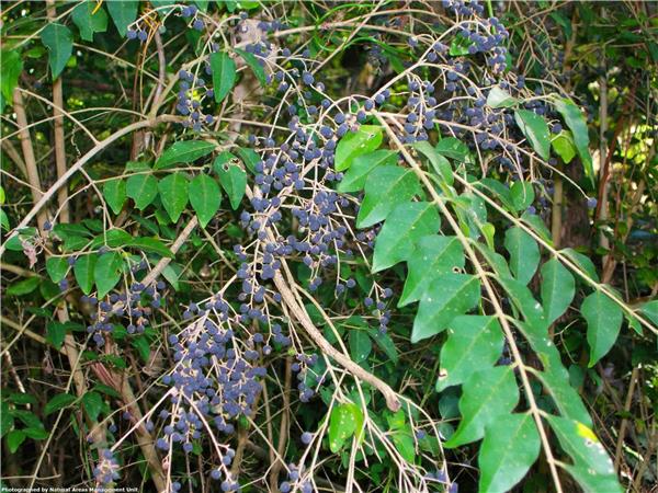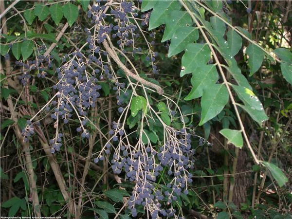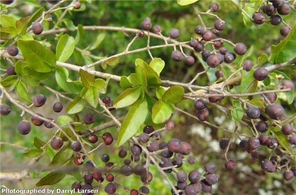 Shrub up to 4m or more if supported. Leaves in pairs, variable in size and shape to 7cm long, short hairs on veins and stalks of young leaves. Flowers small, white with 4 petals heavily scented, in masses. Fruit oval berry to 0.6cm across in dense clusters, green maturing to purple-black, in winter.