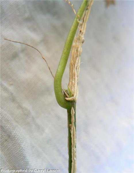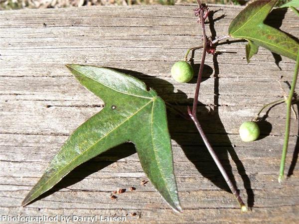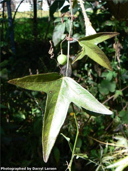 Slender vine with tendrils and raised glands on leaf stalks. Leaves usually 3-lobed with leaf tips of white passionflower more rounded. Green stems become corky with age, small white to greenish flowers and a 1.5cm purple-black berry.