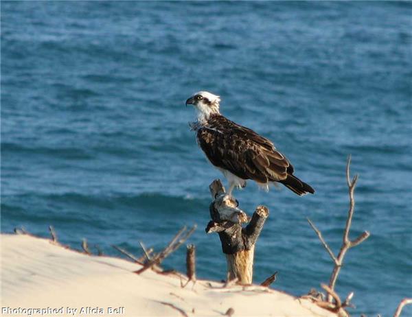 The Osprey is a large, specialist predator of live fish (25-35 cm. in size), foraging over saltwater lakes, beaches, estuaries and rivers, sometimes the ocean. It catches its prey on the wing, often submerging to a depth of 1m to take fish. They use tall live or dead trees as staging and eating points. Nests are conspicuous, often very large and built from sticks in trees or ledges on cliffs. Broad-leaved Paperbark (Melaleuca quinquenervia) and Swamp Oak (Casuarina glauca) are most frequently used nesting material but not critical. This raptor will travel long distances to access suitable feeding and nesting grounds.