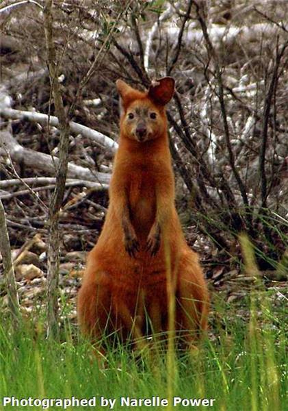 Widespread and probably moderately common where thick vegetation remains. Represented by two forms: the common mainland form, and an island sub-species, the golden swamp wallaby (M. bicolor welsbyi), which is brightly coloured and confined to islands, but with one recent record from Nerang