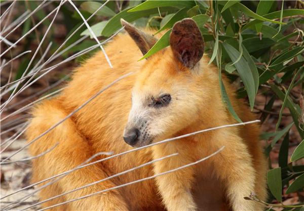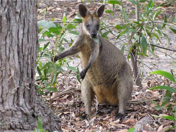 The swamp wallaby can survive in partly fragmented bushland where thick vegetation remains. The island subspecies is unique and of great conservation interest. One golden swamp wallaby has been reorded from the mainland, at Nerang. It had presumably swum and hopped from South Stradbroke Island.