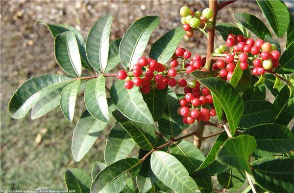 Tree to 10m, short trunk, many branches. Stems pinkbrown, hairy, with lenticels (small corky spots). Leaves compound, with a small ‘wing’ along leaf stalk. Leaflets to 8cm long, mid to yellow-green, sometimes red-tinged, pepper aroma when crushed. Flowers small, 5 petals, cream to white in clusters at ends of branches. Fruit many, round, green berries, ripening to orange/red, about 0.5cm across.